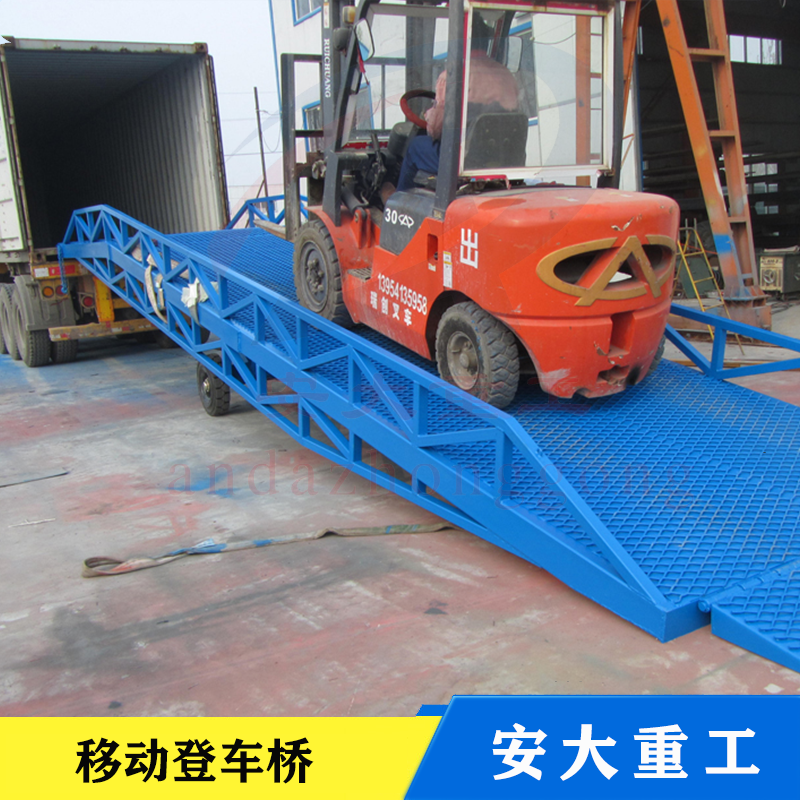 移動式登車橋式與叉車配合使用的貨物裝卸輔助設備,可根據(jù)汽車車廂的高低調節(jié)高度,叉車可以直接通過本設備駛入車廂內部機制進行貨物的批量裝卸,僅需單人作業(yè)即可實現(xiàn)貨物的快速裝卸